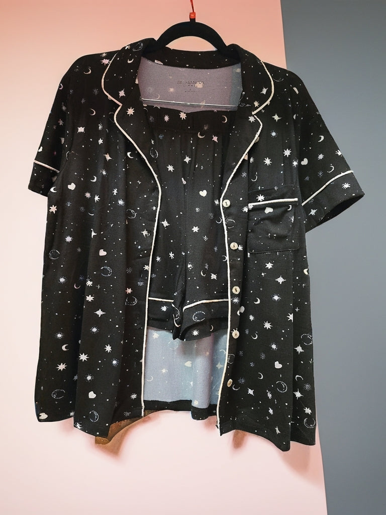 "Sleep under the stars with our Night Sky Short Pajama Set. This playful set features a button down top with a front pocket trimmed in white, and matching elastic waistband shorts. The black background is adorned with whimsical white night sky symbols, making bedtime a dreamy adventure!"