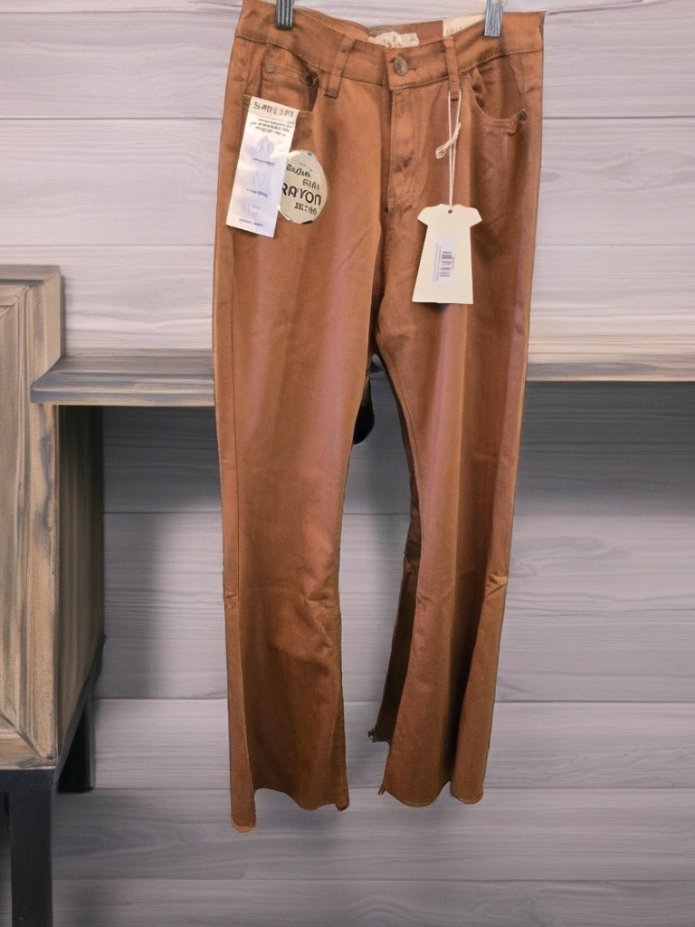 "Flaunt your curves and elevate your style with our Heart of Pine Sateen Stretch Flare Jeans. The high-rise design and waist slimming feature will give you a flattering silhouette, while the flare leg adds a touch of retro flair. Our stretch fabric hugs your curves comfortably and the raw hem adds a trendy touch. Say goodbye to boring jeans!"
