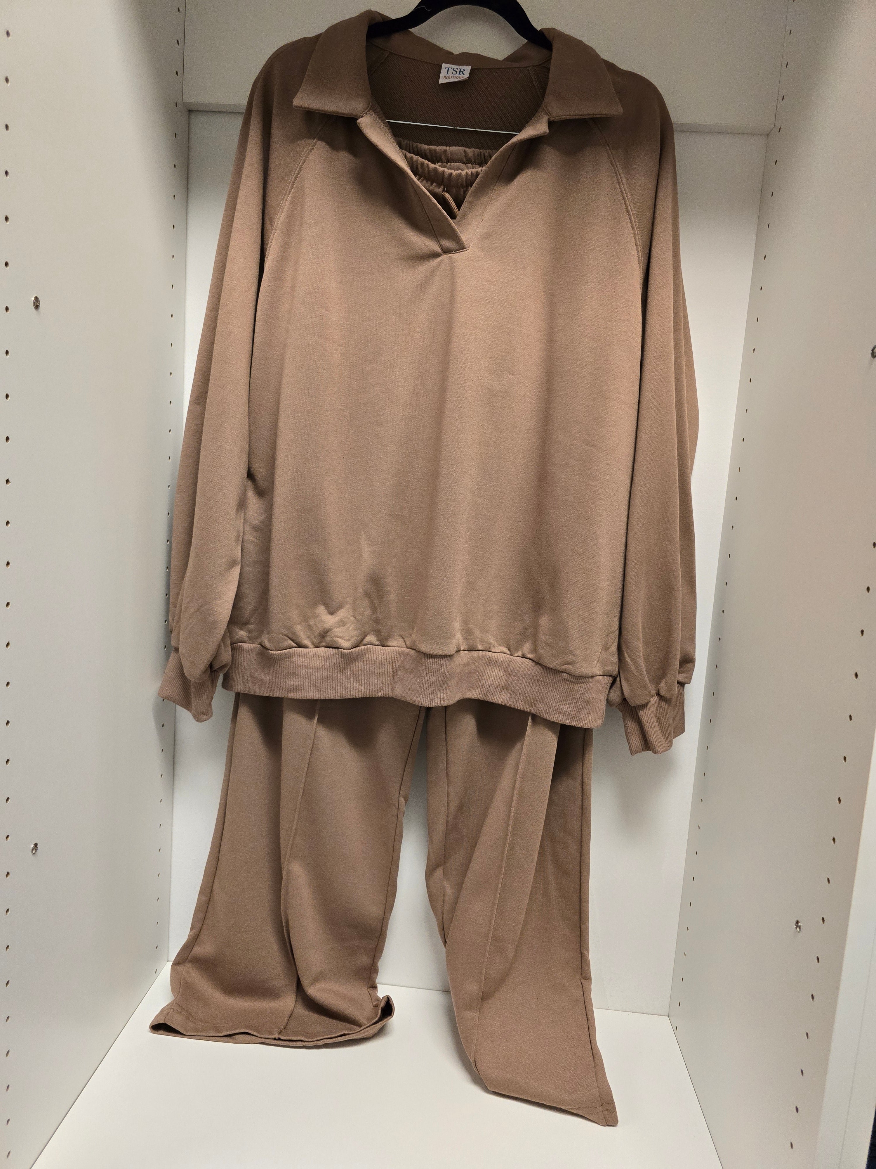 Get comfy with our Wacky Khaki Lounge Set! This 2 piece ensemble is perfect for lounging in style. The pullover top features a trendy v-neck with a turn down collar, while the extra long length adds a unique touch. The pull on bottoms have a draw string and elastic waist band for the ultimate comfort, with wide legs and pockets for convenience.