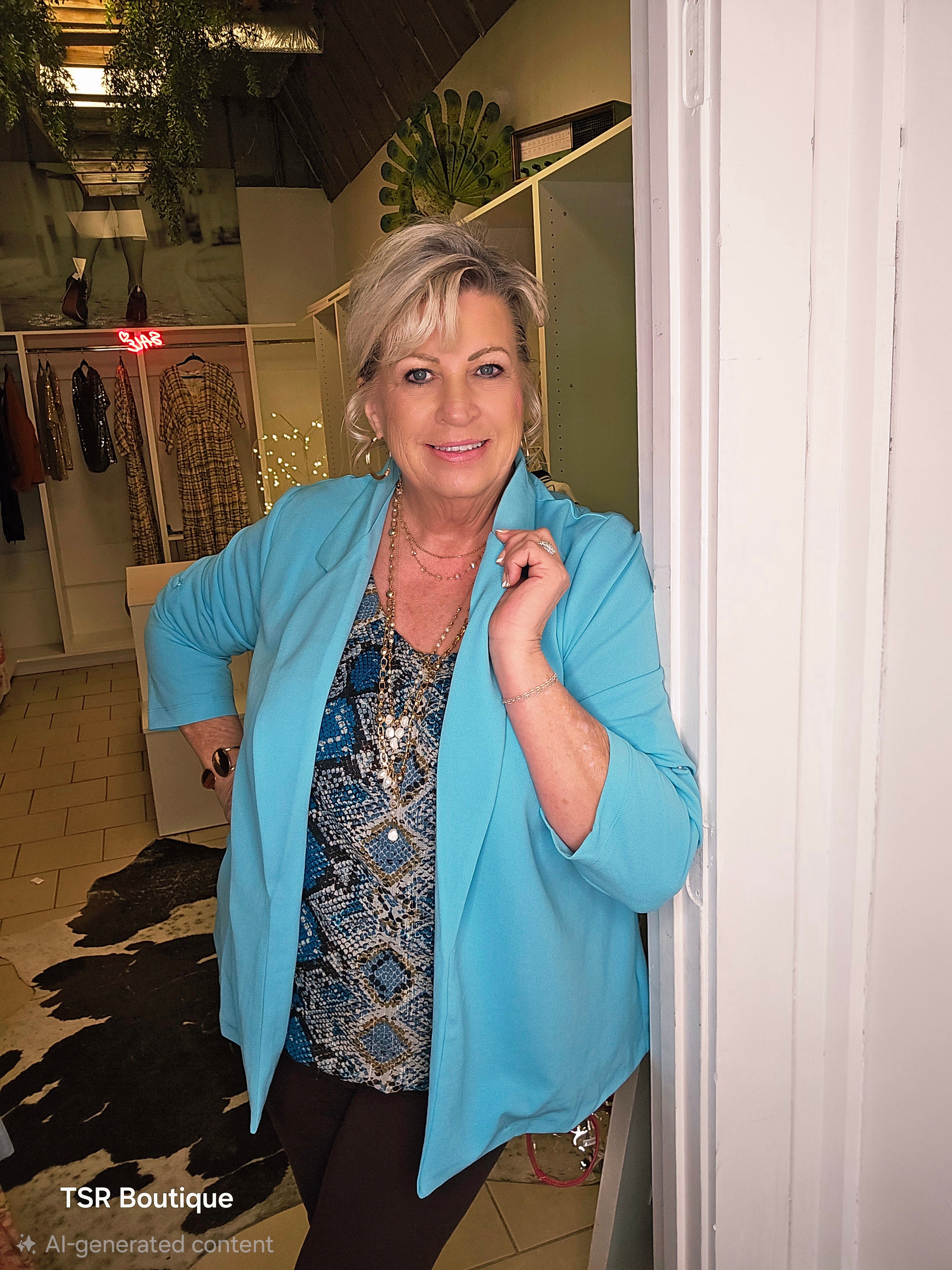 Introducing the Aqua Blazer - the perfect blend of style and comfort. With its open front and turn down collar, this blazer is lightweight and easy to wear. The aqua color adds a pop of color to any outfit, while the button on the sleeve allows for adjustable fit. Look chic and feel at ease with the Aqua Blazer.