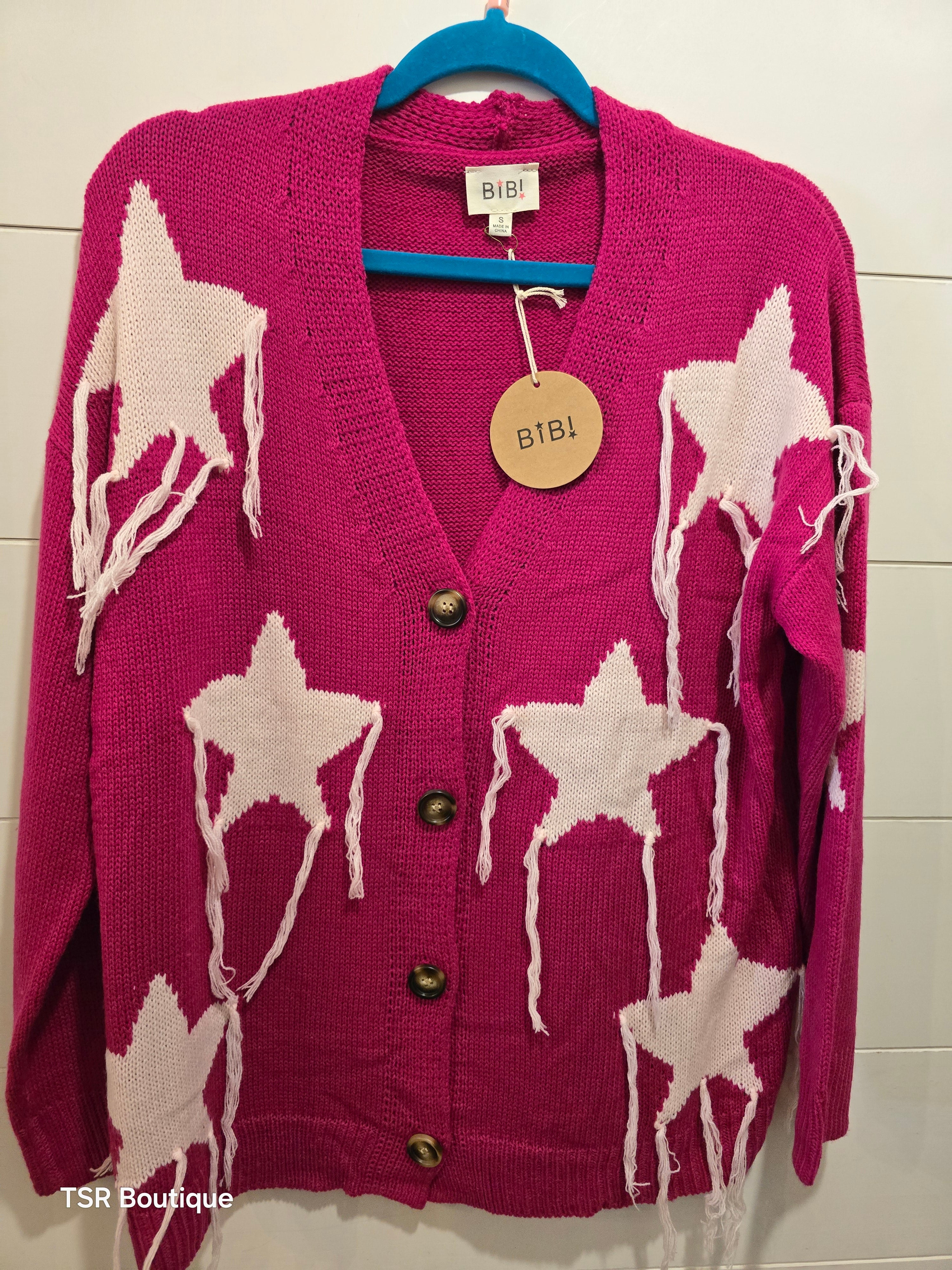 Get ready to twinkle in the Oh My Stars Sweater! This hot pink button-up is splashed with funky white stars and features playful tassels (because who doesn’t want to strut their stuff with a little flair?) The long sleeves and V-neck keep it cozy yet chic—perfect for those "I need a pick-me-up" days! (Stars not included, but we think you’ll shine brighter anyway!)