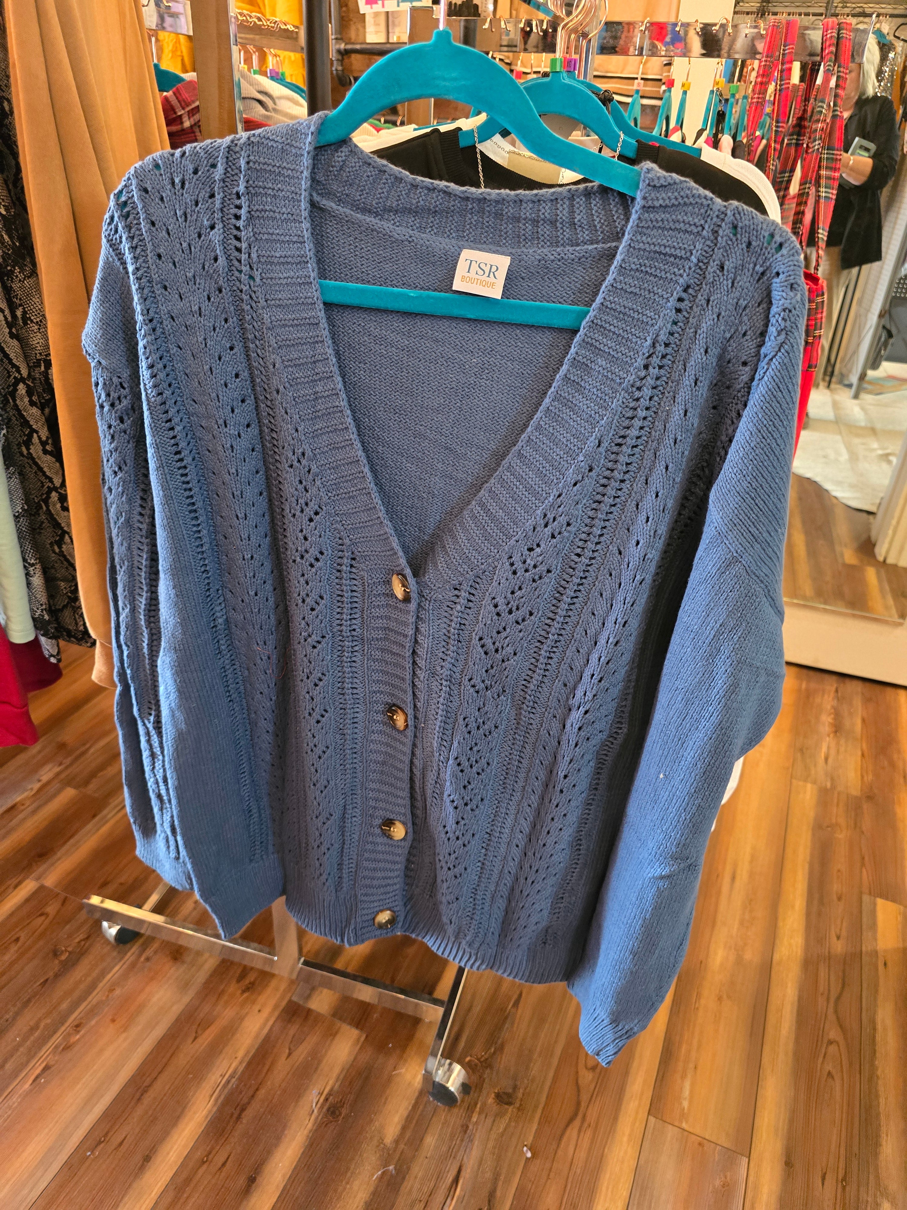 This vintage dusty blue cardigan is a versatile and stylish addition to any wardrobe. It features a button-up design with long sleeves and is crafted from soft, high-quality material. The tortoise shell buttons add a touch of elegance to this classic sweater cardigan. Perfect for staying cozy and chic in any season.