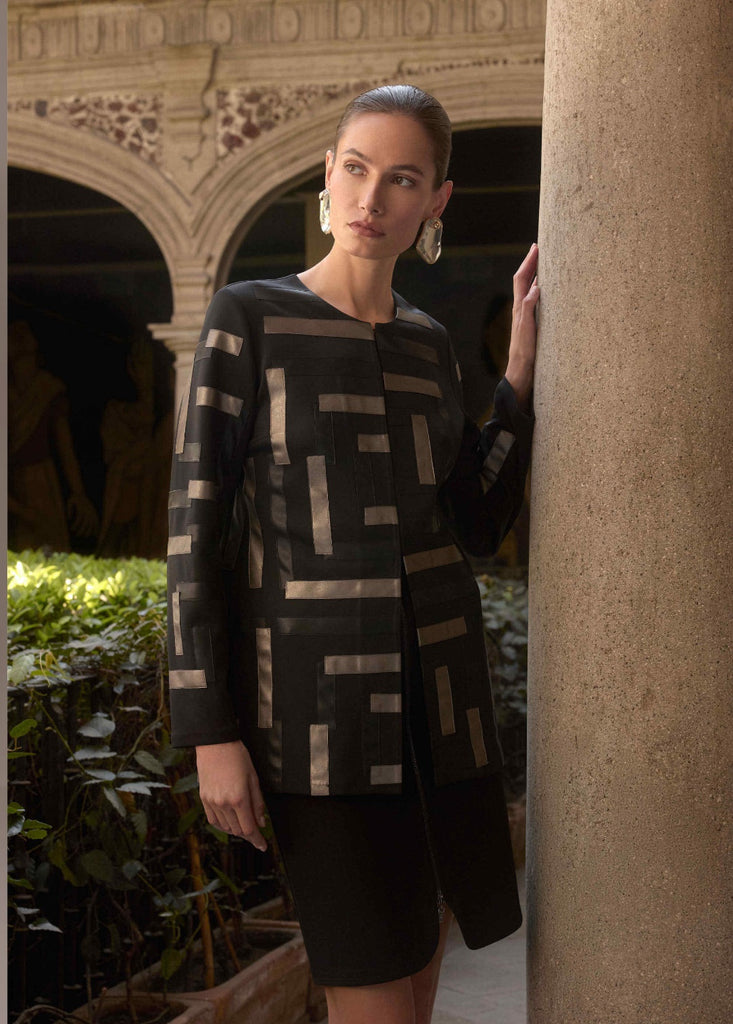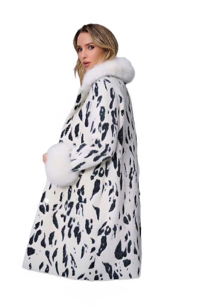 Feather Yarn Animal Jacquard Coat with Faux Fur Trim