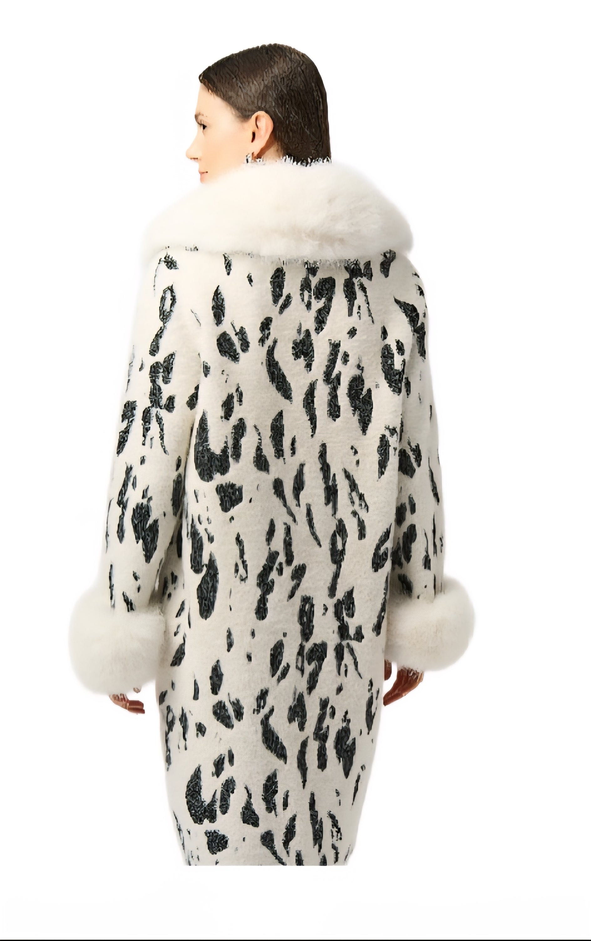Feather Yarn Animal Jacquard Coat with Faux Fur Trim