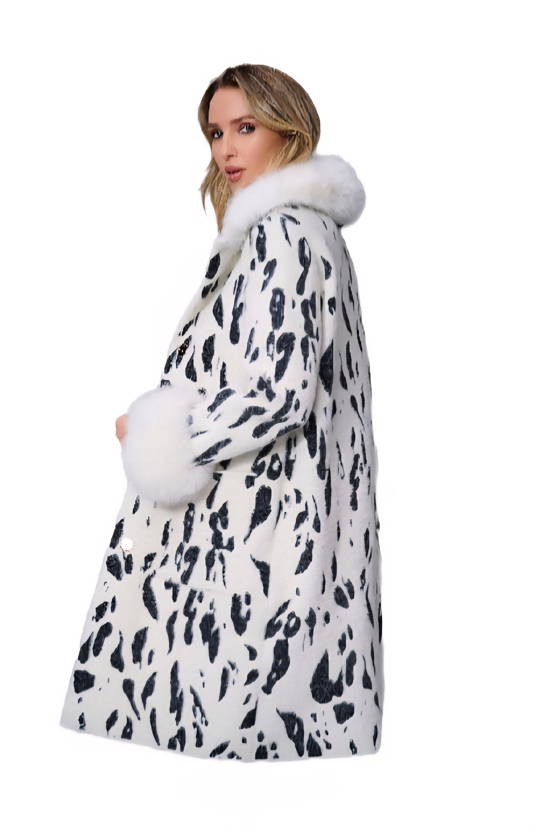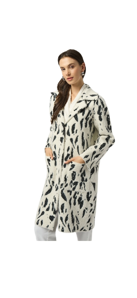 Embrace your wild side with this bold coat, showcasing a striking animal print and luxe faux fur trim at the collar and cuffs. Crafted from feather yarn sweater knit, it boasts an irresistibly soft texture, while the notched collar and straight silhouette exude timeless sophistication. Destined to be a standout in your cold-weather wardrobe, this coat is the perfect blend of daring style and cozy elegance.