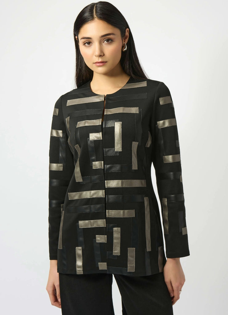 Stand out effortlessly in this collarless scuba knit jacket, crafted to leave a lasting impression. Bold two-tone faux leather patches infuse the design with artistic character, while long, straight sleeves lend a sleek and modern touch. Finished with a discreet hook-and-eye closure, this piece redefines polished sophistication.