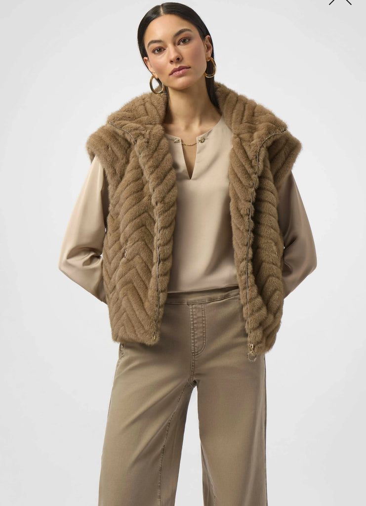 Stay warm and stylish this winter with the Joseph Ribkoff Mink Vison Vest. Made with luxurious mink faux fur, this vest features a convenient zip front and zippered side pockets. Keep cozy and on trend with this must-have addition to your wardrobe.