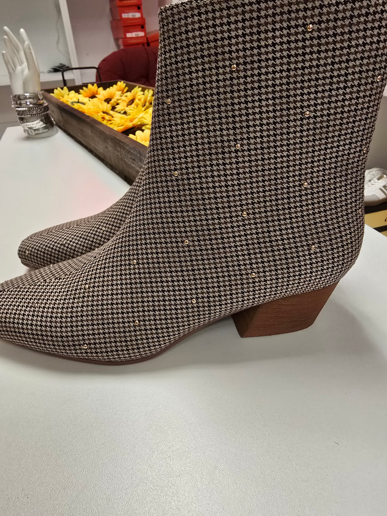"Take a walk on the wild side with these ankle boots! Featuring a bold houndstooth print and check fabric upper, these boots are sure to turn heads. The side zipper makes for easy wear, while the 2 1/2 inch block heel and square toe provide comfort and style. Such a tease, but oh so worth it! (Get it? Corkys...tease...nevermind.)"