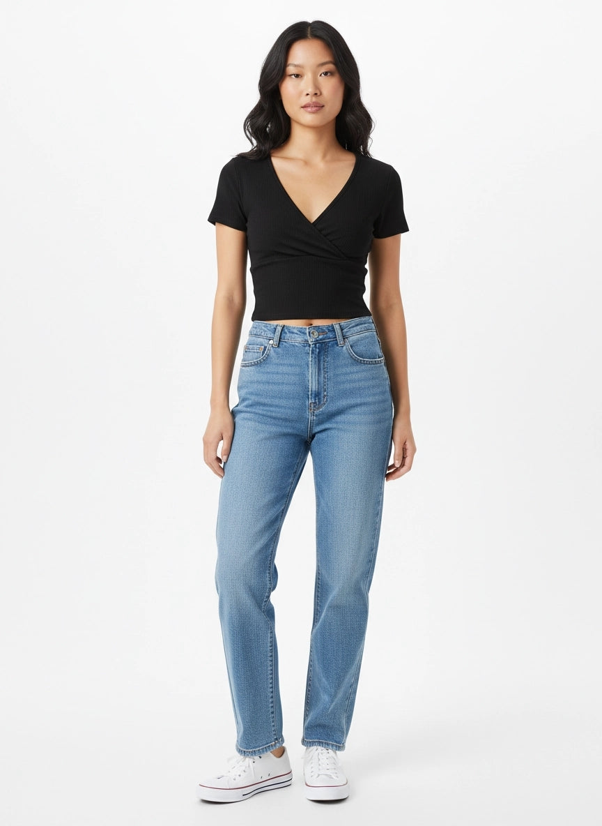 Meet your new wardrobe MVP: the Black Ribbed Crop Top! This short-sleeve wonder sports a V-neck that’ll show off your charming collarbones (and hopefully distract from that “just one more episode” binge-watch face). With a snug banded waistband, it’s pullover perfection for lazy days or spontaneous dance-offs!
