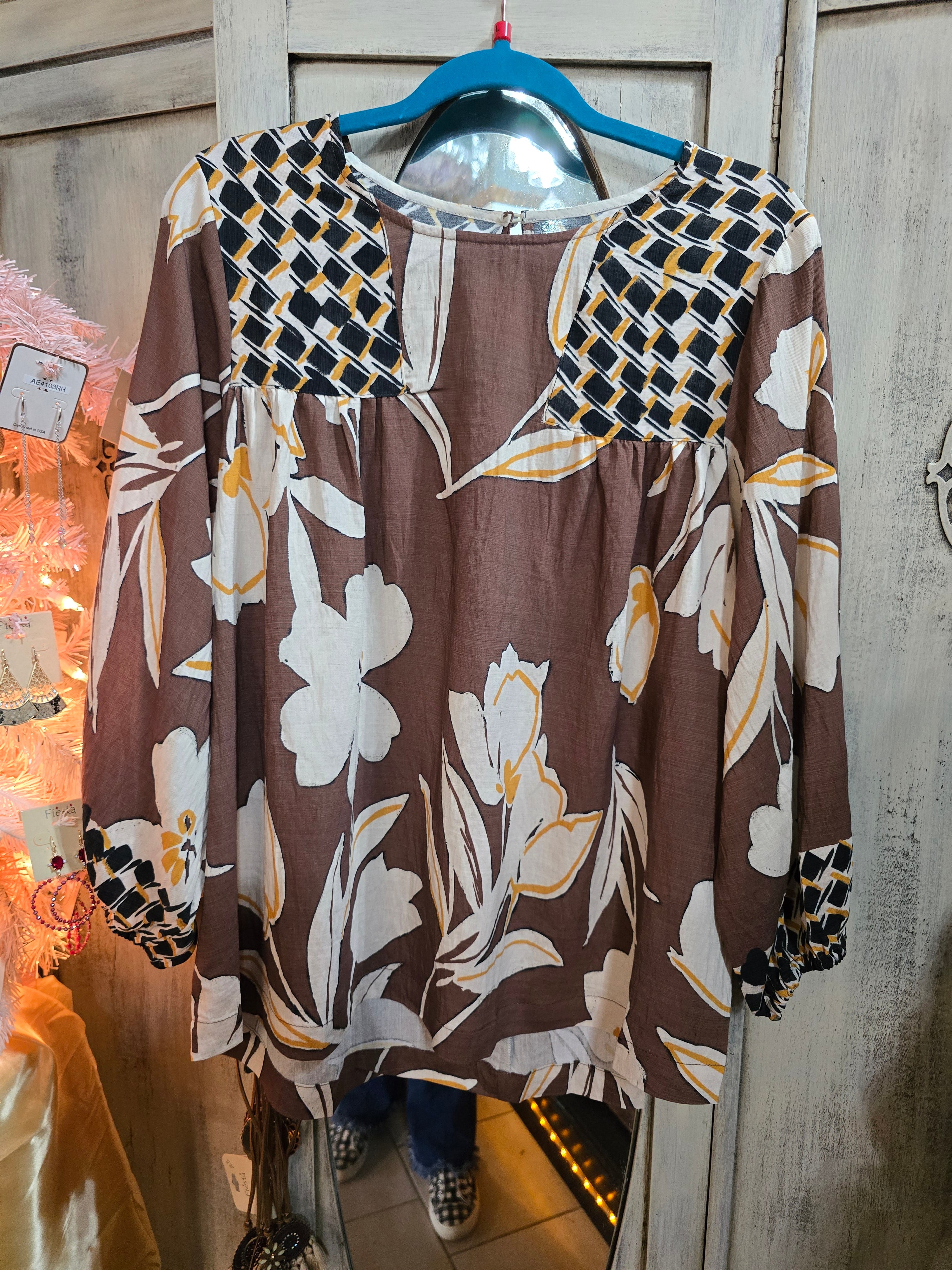 Introducing the Brown Mixture Top - a versatile and stylish addition to your wardrobe! With three-quarter sleeves and an elastic band, this top offers both comfort and style. The brown background is accented with cream flowers and gold detailing, while the patchwork design adds a touch of uniqueness. Perfect for any occasion!