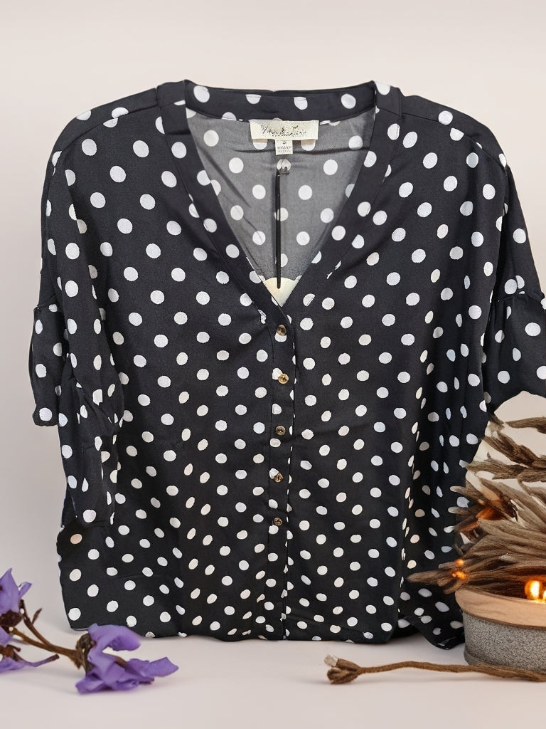 Meet the Dot to Dot Top—a fashionable puzzle waiting to be solved! With its flirty short ruffle sleeves and V-neck, you’ll be turning heads faster than you can say “button me up!” (And yes, it’s 100% polyester—meaning it's as comfy as a cloud on a lazy day.) Plus, that hi-lo hem? It’s like a party in the back and a business meeting in the front! Perfect for those who love to keep it fun and fabulous!