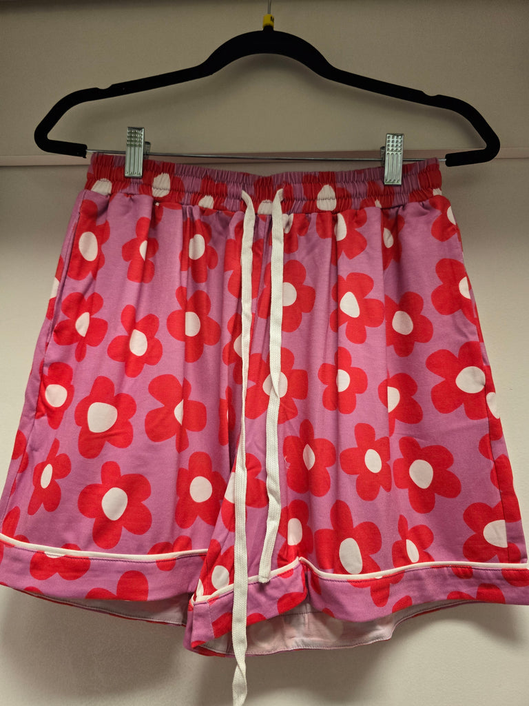 Get ready for sweet dreams with our Good Night Flowery Shorty PJ Set! This two-piece set features a button-up top with a turn-down collar and pocket on the left chest, accented with white trim. The bottoms have a short length and elastic waistband, complete with a tie string and matching white trim. Sleep tight in this playful and comfortable pajama set!