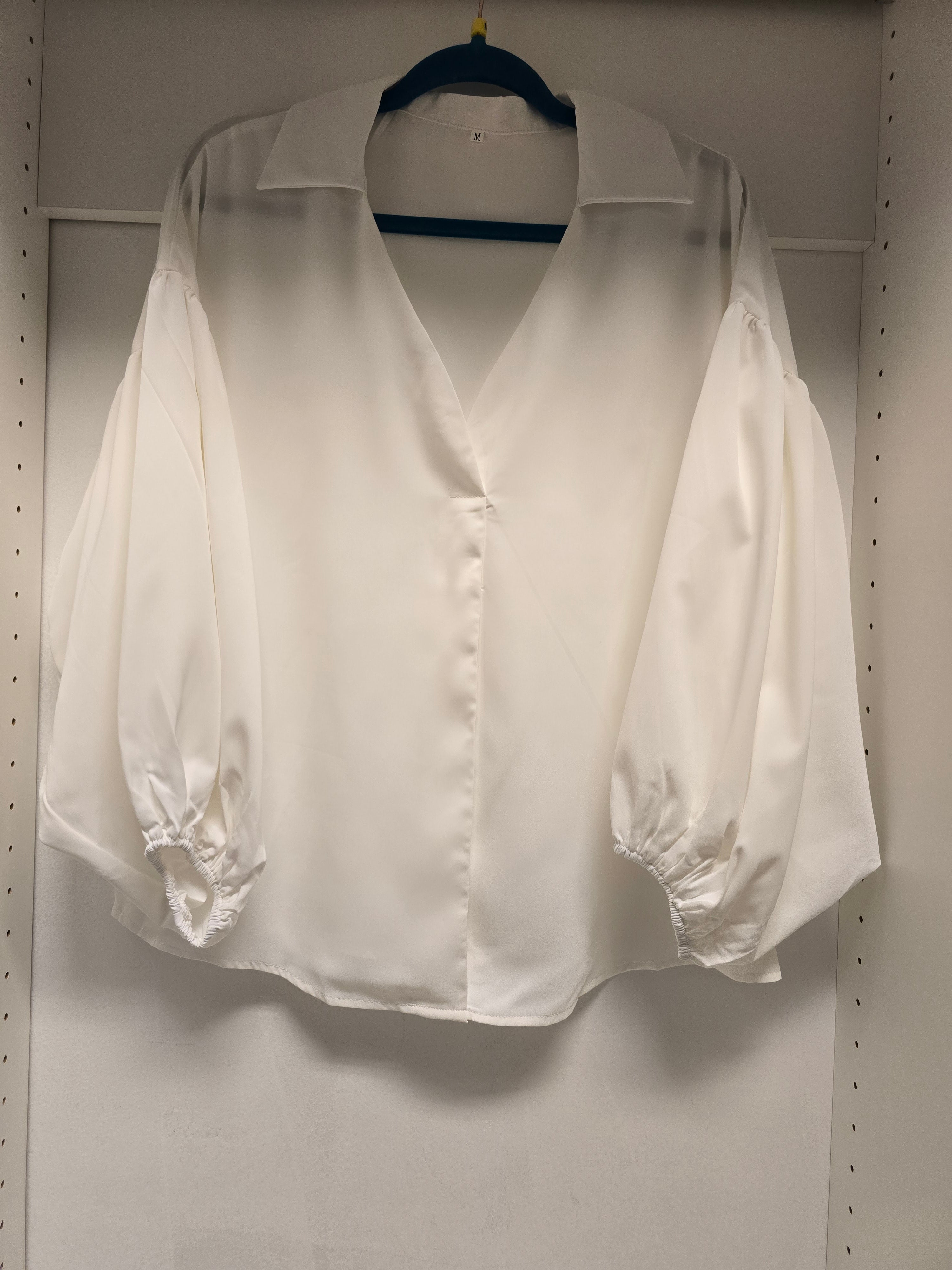 "Stay stylish and cozy this winter with our White Lantern Sleeve Blouse. With its winter white color, long lantern sleeves, and half button collar, this blouse will keep you looking chic and on trend. The V-neck adds a touch of femininity to this must-have piece. Perfect for any occasion. (White never looked so good on you!)"