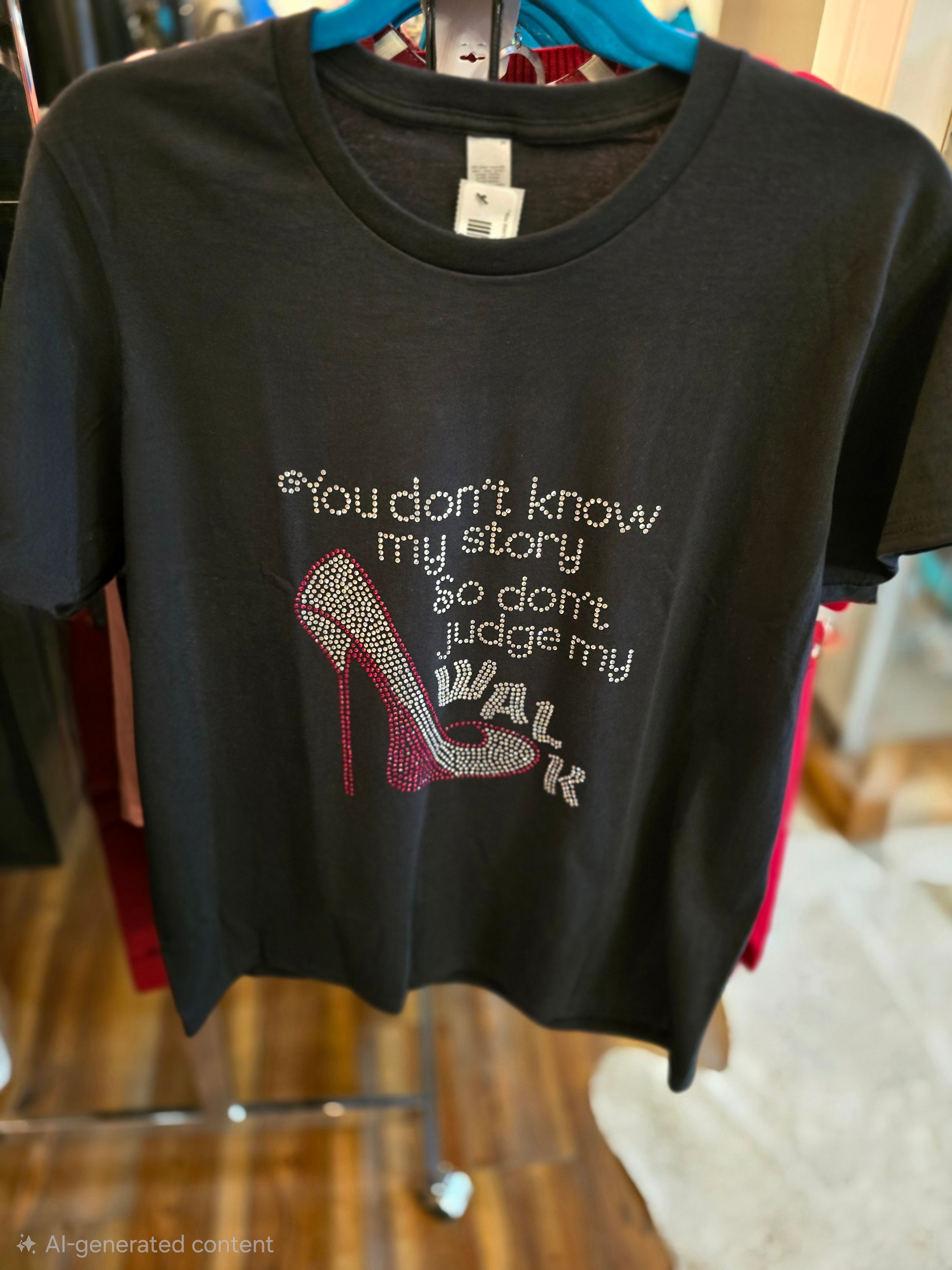Walk in style with our "You don't know my story" Tee shirt. Short sleeve black shirt with silver sequin letters that say it all. And don't miss the high heel design in silver and pink sequins, adding extra flair to the message. Show off your unique and sassy side with this playful and bold t-shirt.