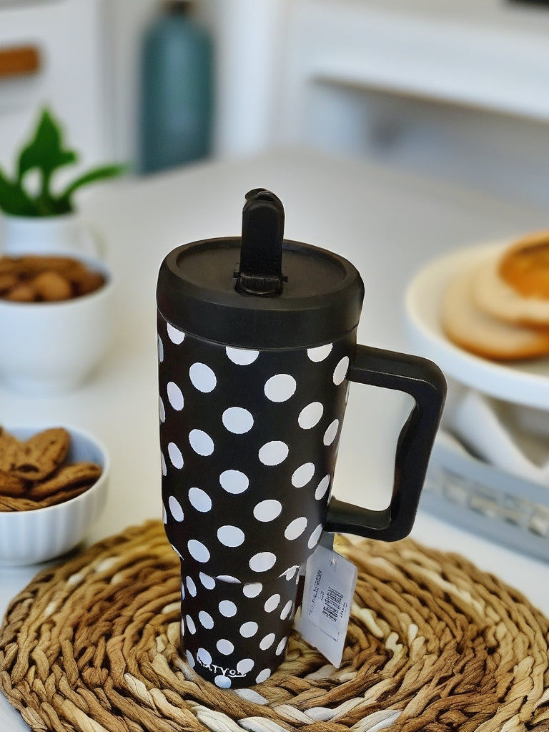 Sip your favorite brew in style with the White Polka Dot Tumbler! Sporting a chic black base decked out in playful white polka dots, this beauty is like a disco party for your drink. Its screw top keeps spills at bay (because no one wants a coffee catastrophe!), and the handy handle means you can strut with your drink without a care. Perfect for caffeine enthusiasts or anyone looking to add some pizzazz to their hydration game!
